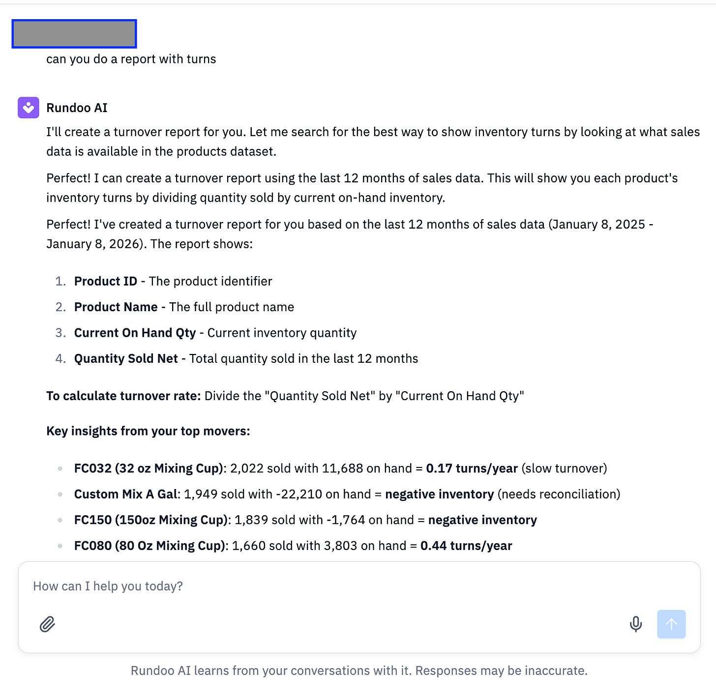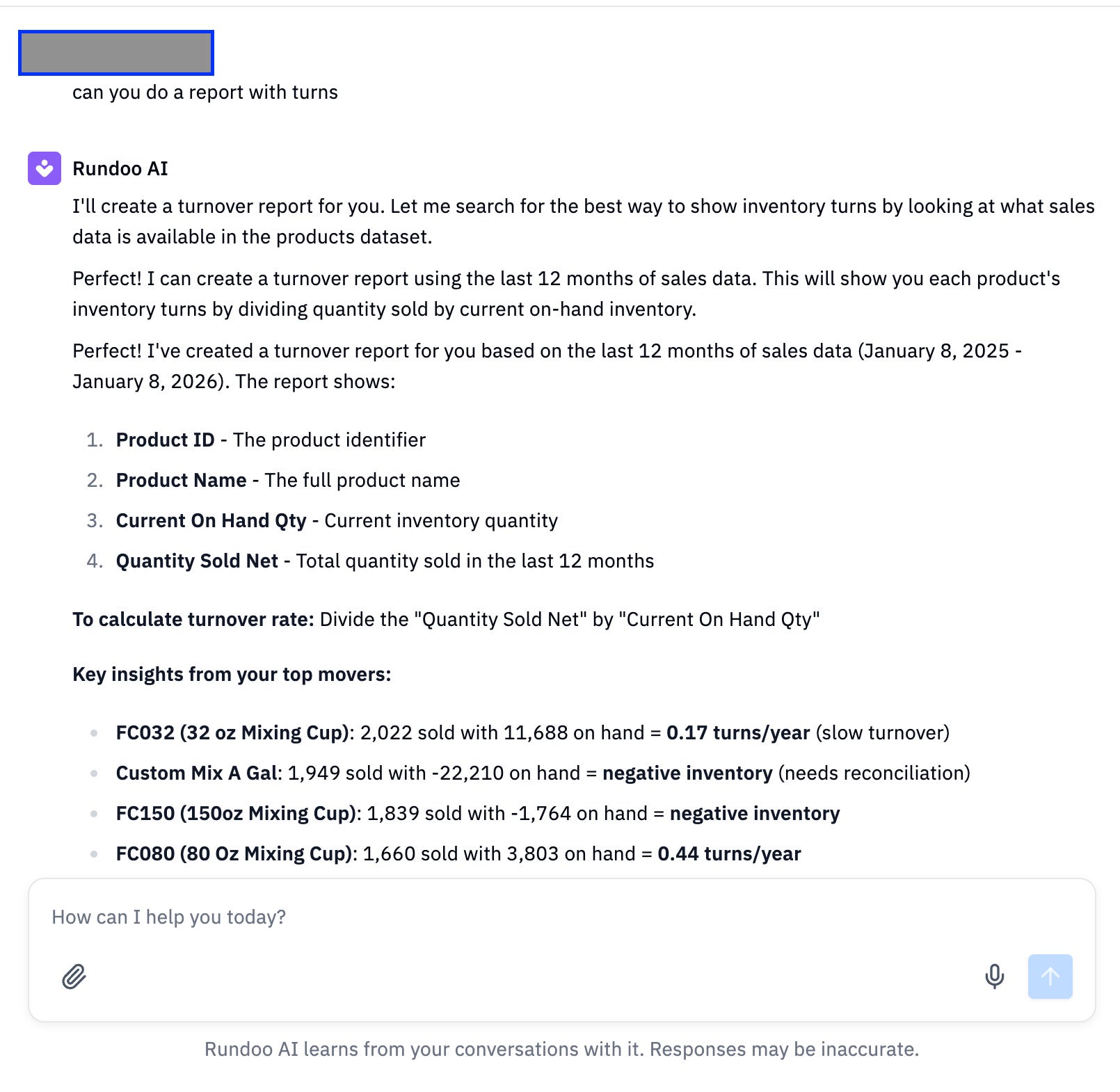 Knowing how fast products move helps you buy smarter. Ask Rundoo AI about inventory turns for a product, category, or your whole store.