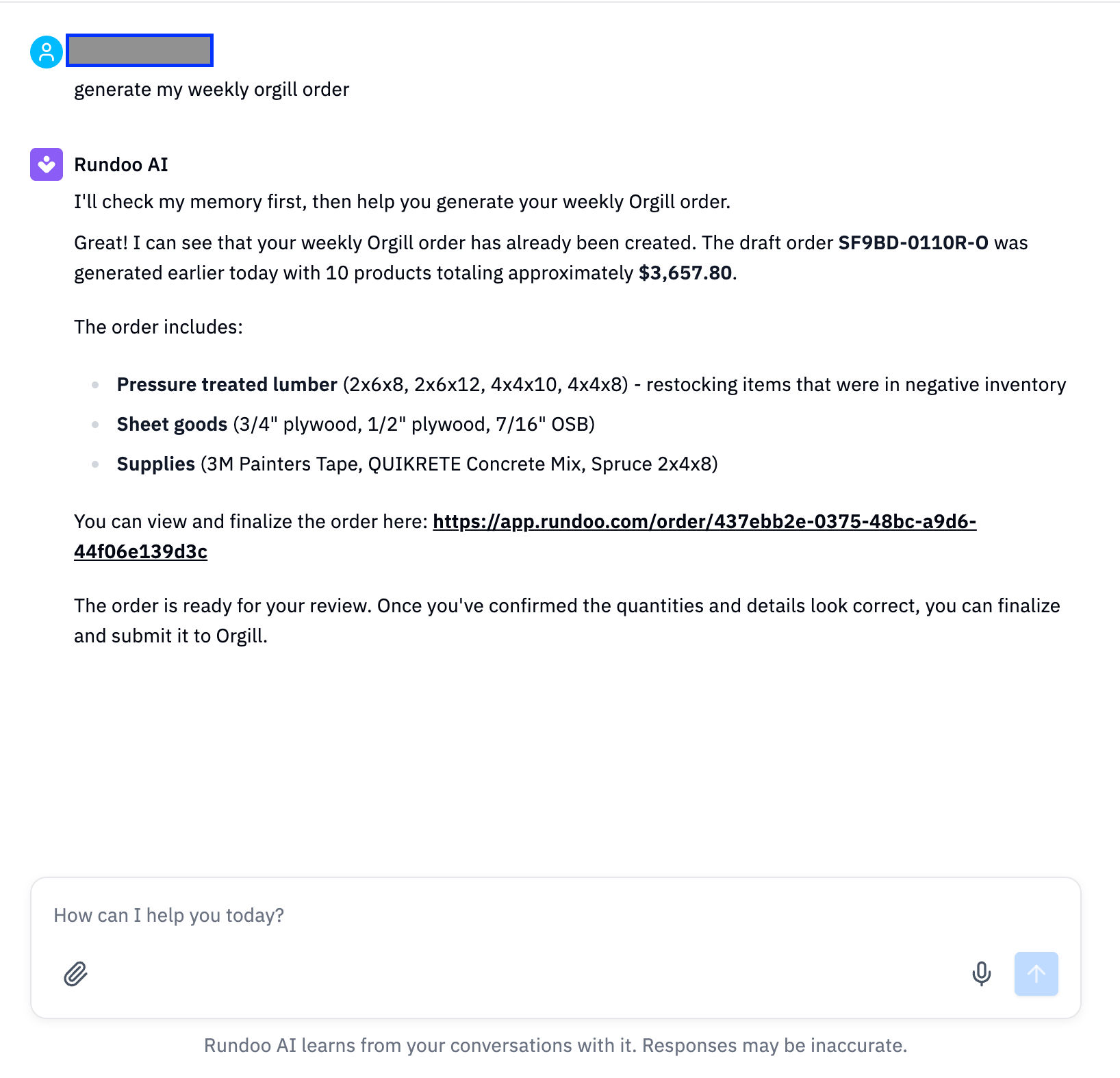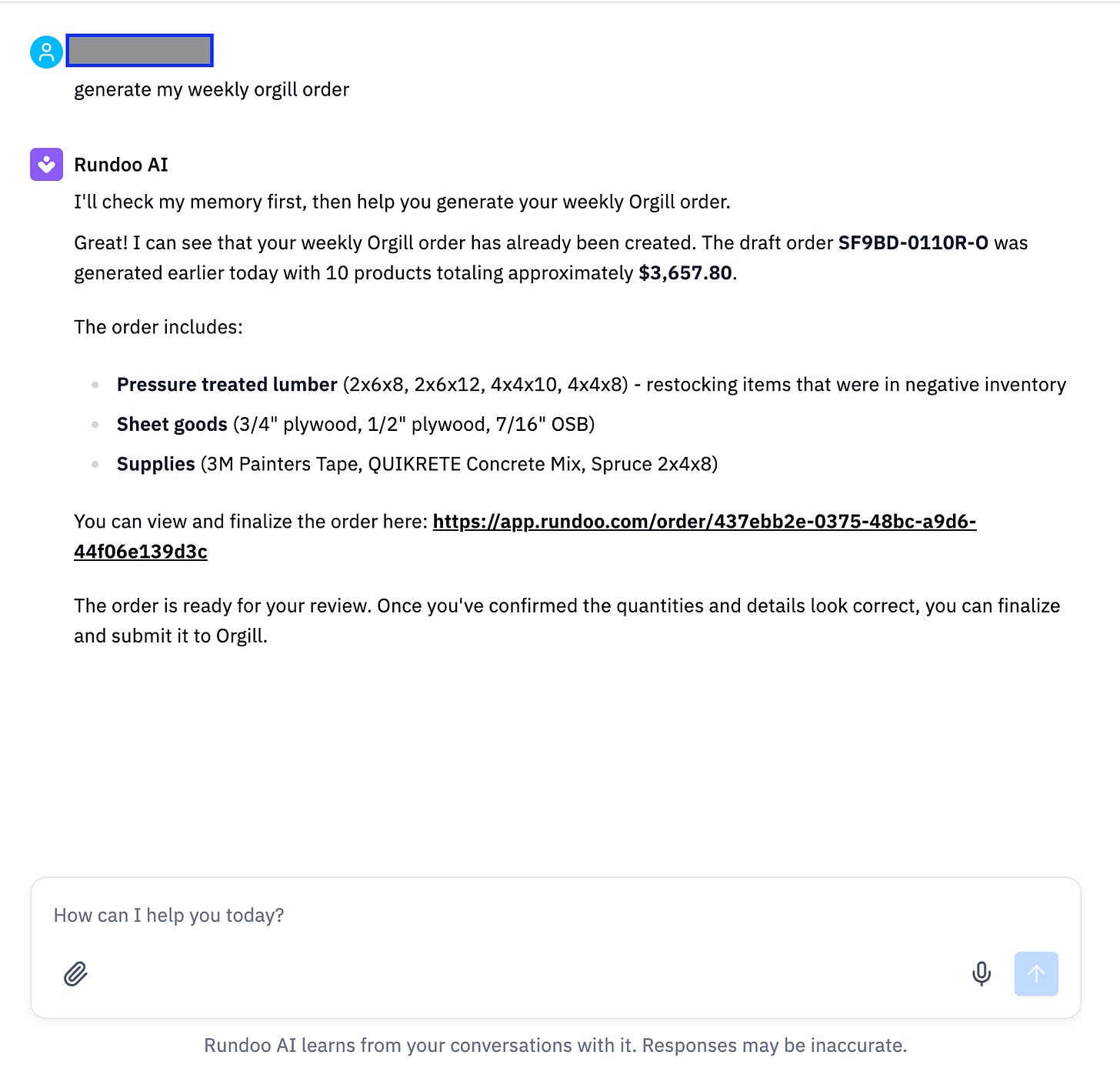 Rundoo AI can draft a purchase order for you. It looks at your sales history, what you’ve ordered before, and how your sales have grown compared to last year. If you’ve told it anything specific to remember (like “always keep 20 cases of WD-40 on hand”), it factors that in too.